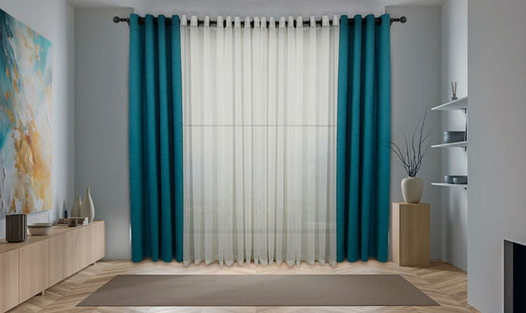 از پرده کتان آبی فیروزه ای می توانید به همراه رنگهای زرد – سرمه ای – طوسی نرمال – طوسی فیلی یا به همراه پرده حریر استفاده فرمایید .